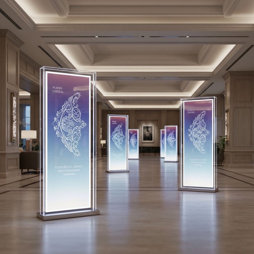 Elegant reception area displays and information systems for luxury hotel chain.