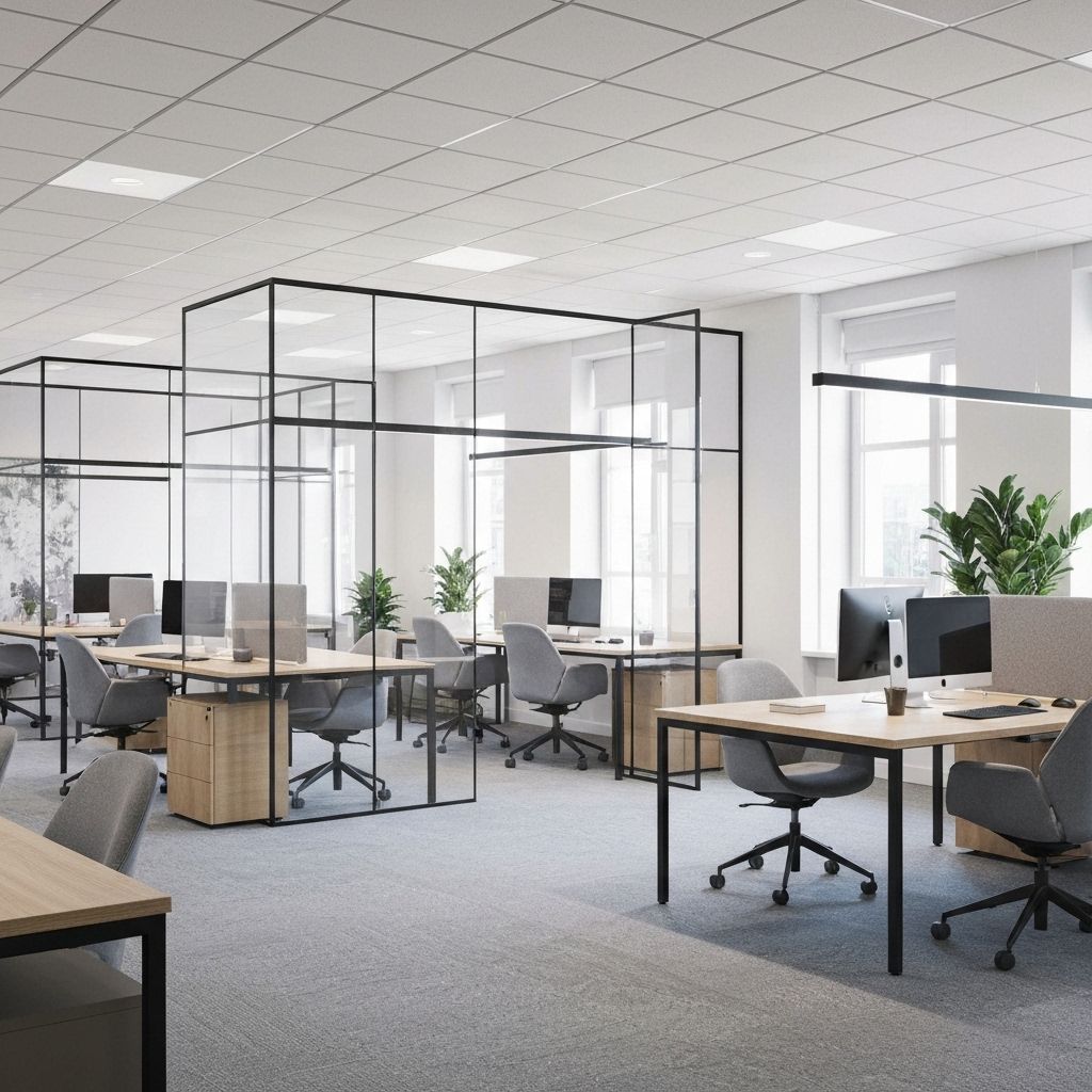Modern office transformation with custom acrylic partitions, wall treatments, and branded elements.